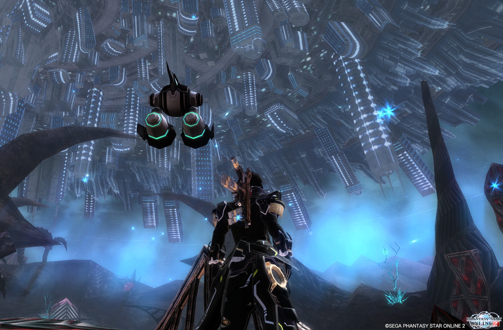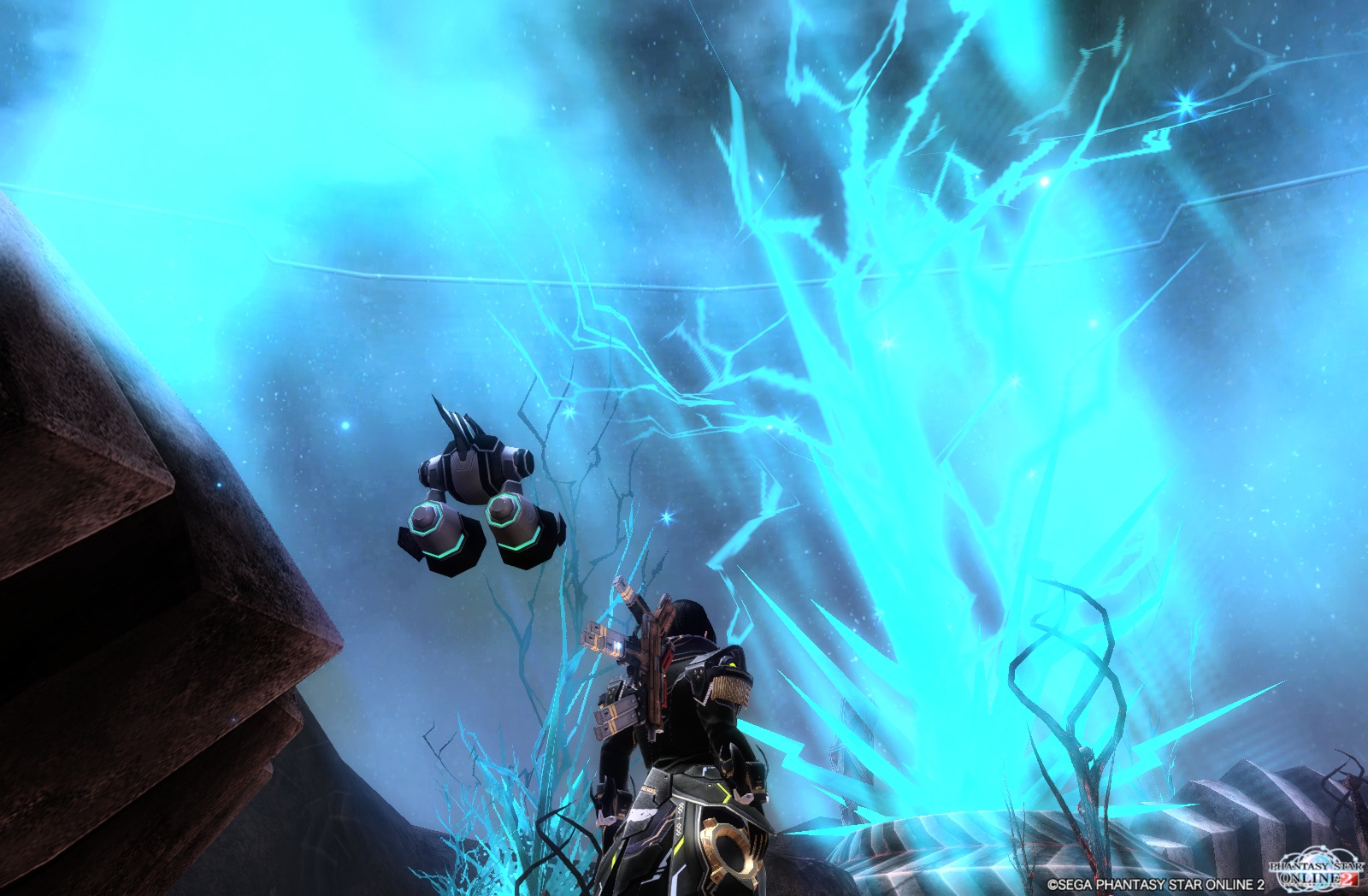 なんか、フィールドに生えている?青緑色の結晶体の輝きが増して、フィールド全体が淡く青くなって、フォトンのようなものがきらきらと輝いてました。